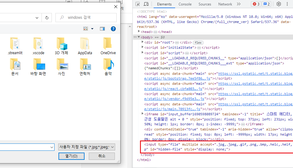 처음에는 input 태그를 찾을 수 없습니다. 하지만 사진 버튼을 클릭을 하고 나면 input tag가 생성됨을 확인할 수 있습니다.