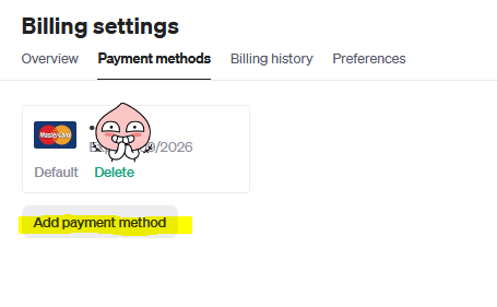 4)카드 정보를 입력하고, Set as default payment method를 체크합니다. Add payment method를 클릭하여 저장합니다.
