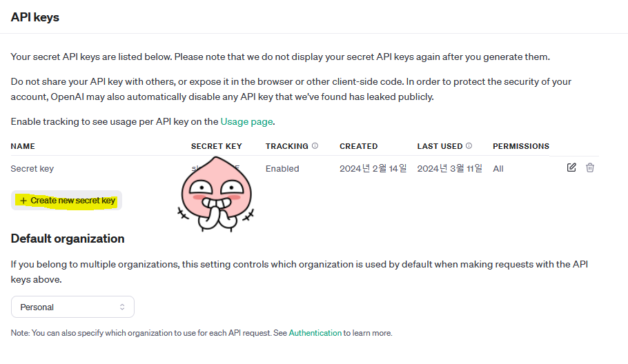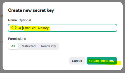 API Key는 Chat GPT를 API로 사용하기 위해서 사용자를 식별하는 고유 Key 입니다.