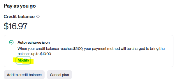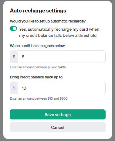 Create balance & Recharge 는 잔액 설정 계획으로서, API 가용량이 일정 수준 이하로 떨어지면 자동으로 결제하여 API 가용량을 항상 일정수준으로 이상으로 유지해 주는 기능입니다. 중단되지 않는 서비스에 Chat GPT를 활용하고 있다면 반드시 등록해야 합니다.