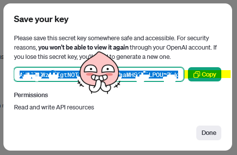 4)발급된 API Key를 Copy 기능을 이용하여 복사한 후 따로 저장을 합니다. Done을 클릭합니다.