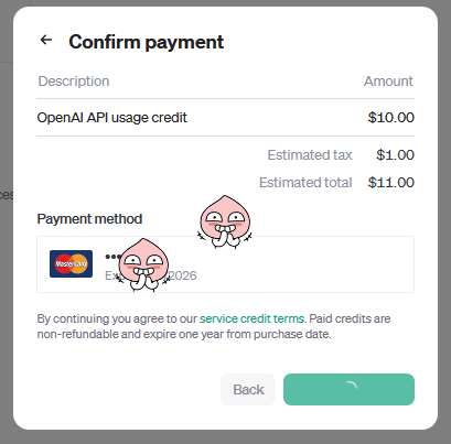 3)Confirm payment를 수행하여 10$ 잔액을 설정합니다. 이 때 실제 결제가 이루어 집니다.